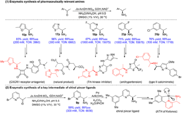 近日,我院姜艳军教授和刘运亭副教授等通过酶分子挖掘与改造,获得了活性高且底物谱广的胺脱氢酶突变体(Ja-AmDH),实现了酶催化α-(杂)芳基烷基酮的直接不对称还原胺化,并应用于药物分子和手性配体关键中间体的高效不对称合成,为手性α-(杂)芳基伯胺的高效不对称合成提供了一种简便的方法。