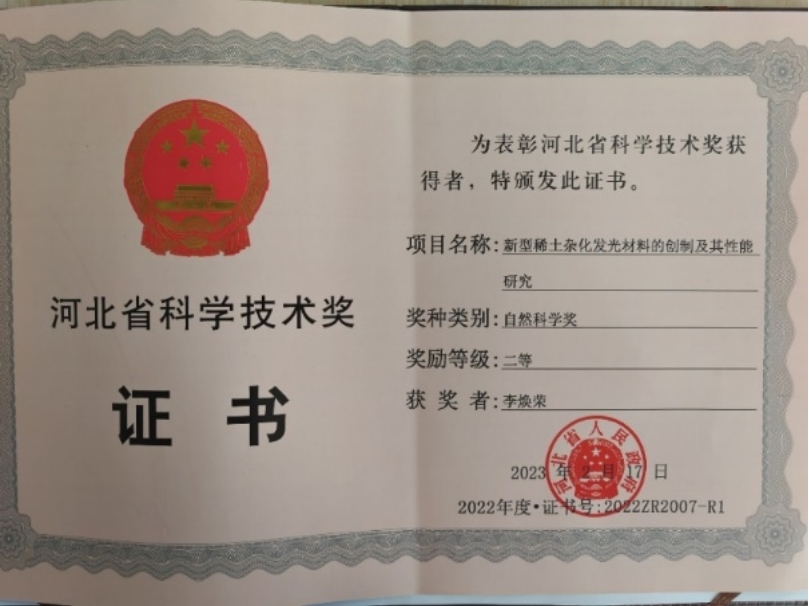 围绕稀土配合物发光体系的稳定性提升、发光性能调控和优化以及应用拓展等问题,团队在刺激响应型稀土超分子发光材料的设计和环境友好构筑,超分子体系中主体材料对客体分子发光影响规律和影响机理机制的认识,光控稀土超分子体系的构筑,以及稀土超分子发光材料在防伪、荧光传感与检测、白光LED照明和光伏领域的应用等方面,取得了系列原创性成果,具有鲜明的特色,得到了国内外同行的高度关注和认可(Angew. Chem. Int. Ed. 2020, 59, 21752; Angew. Chem. Int. Ed. 2018, 57, 2194; Nat. Commun. 2021, 12, 1363; Angew. Chem. Int. Ed. 2019, 58, 18025; Angew. Chem. Int. Ed. 2014, 53, 2904; Angew. Chem. Int. Ed. 2010, 49, 1434; Adv. Sci. 2019, 6, 1901529)。部分成果获河北省自然科学一等奖和二等奖各一项。