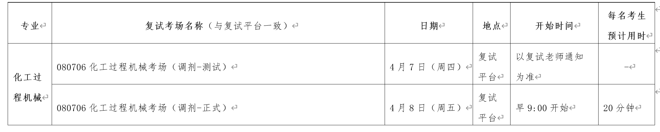 3、复试流程。化工过程机械专业设置1个考场,考生按照复试平台显示的顺序号依次进入考场进行复试,复试三个环节的考核一次性完成。