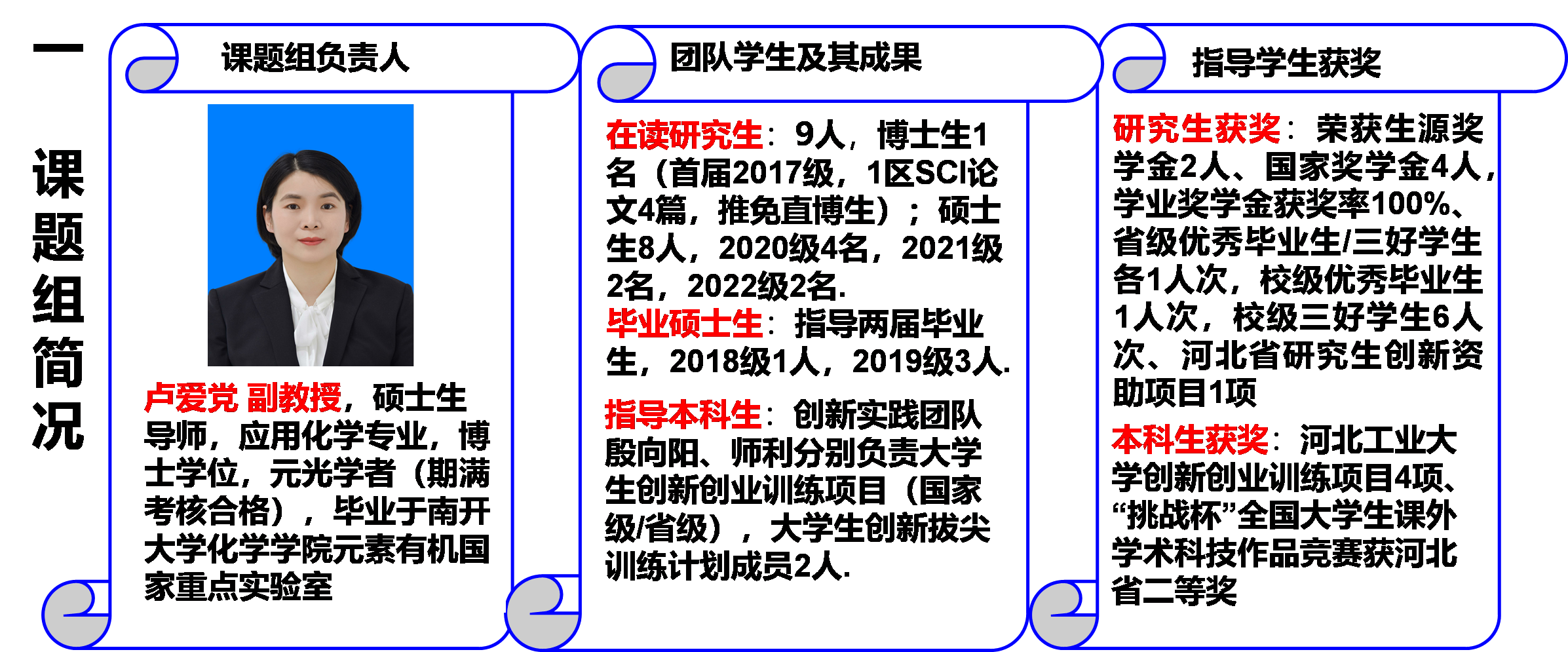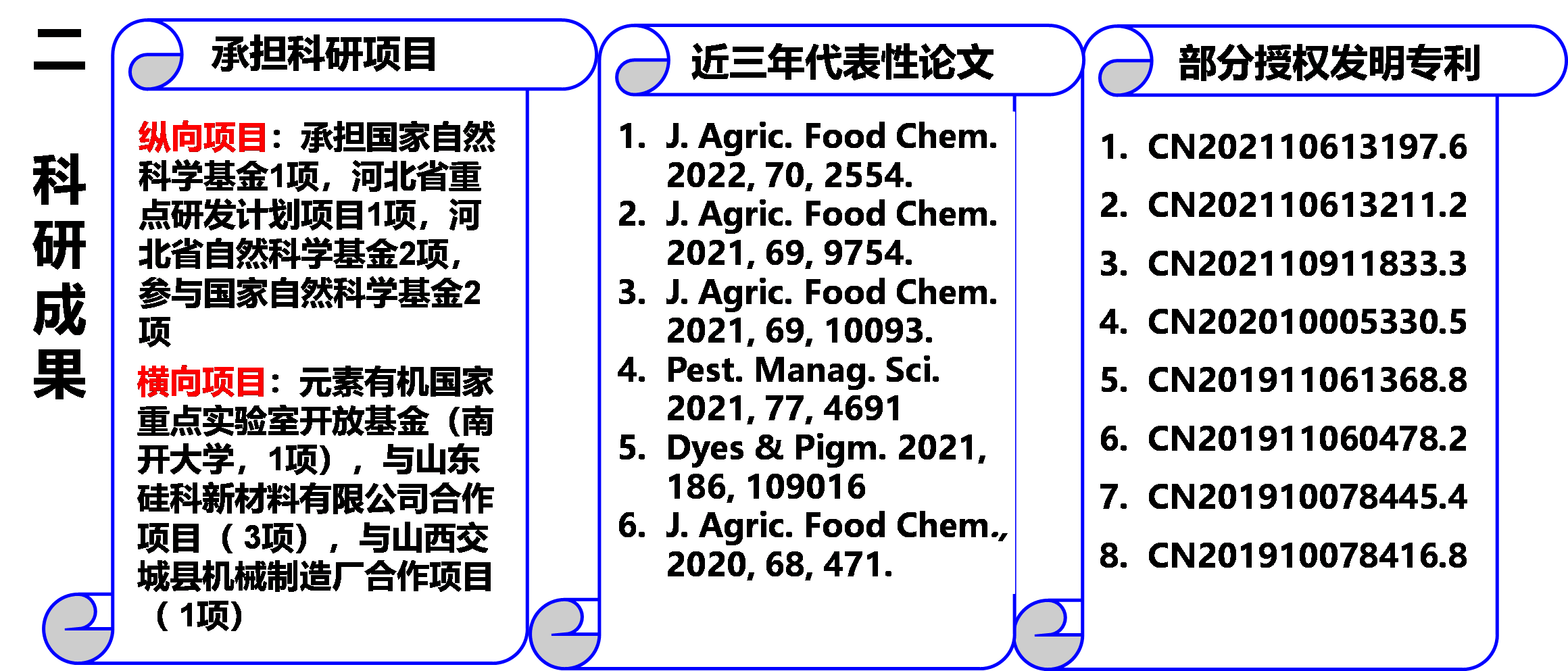 课题组研究生招收专业为河北工业大学威廉官网中国官方网站的“化学工程与技术(全日制)”和“化学工程(全日制专业学位)”专业。研究方向为天然生物活性物质的发现及应用、高值农用化学品的绿色合成、精细有机合成;针对农业生产的病虫害问题,筛选出天然产物及其衍生物进行防治;利用化学-酶法实现高值农用化学品及其重要中间体的绿色合成;针对人体、环境及食品中重金属和有机物污染的问题,设计新型荧光探针实现高灵敏检测。