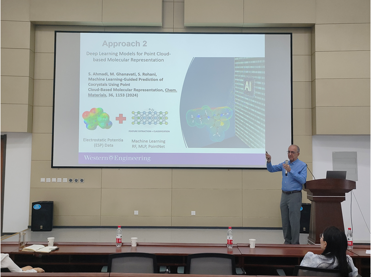 Sohrab教授致力于工业结晶领域的研究,特别是药物结晶的批量连续过程设计、操作、建模、监测和控制,旨在解决活性药物成分(原料药)的实际生产问题。讲座中,Sohrab教授提出了一种基于AI预测的策略,用于筛选工业上的具有多种重要意义的药物分子,并进一步介绍了药物递送系统的研究方法。