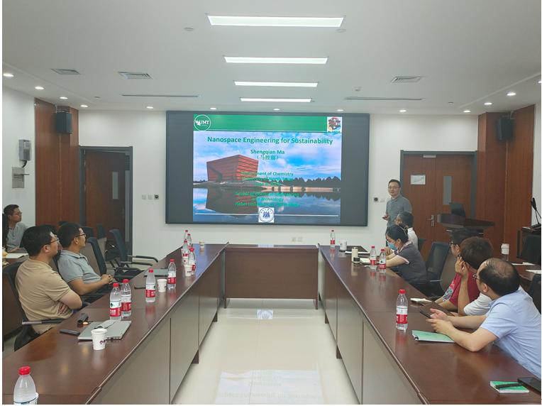 本次学术交流活动中,王瑞虎院长首先向特邀嘉宾介绍了河北工业大学威廉官网中国官方网站的发展沿革和教学科研情况。然后,马胜前教授做了题为《Nanospace Engineering for Sustainability》的报告,详细探讨了COF(共价有机框架)、MOF(金属有机框架)和POP(聚合物有机孔洞)材料的结构特点和稳定性。通过在催化、污染控制和电极材料中的应用案例,揭示了这类多孔材料在能源、生物和环境保护方面的广泛应用潜力。