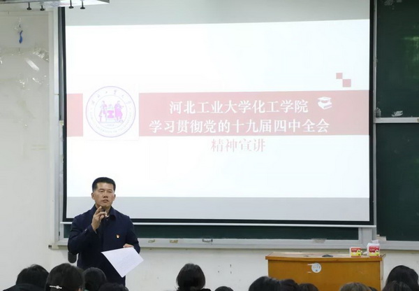 郭宏飞按照校党委要求,全文传达了“河北工业大学学习贯彻党的十九届四中全会精神宣讲提纲”,向全体参会教职工介绍了党中央在“两个一百年”奋斗目标历史交汇点上召开的这次十分重要的会议,是在新中国成立70周年之际、我国处于中华民族伟大复兴关键时期召开的一次具有开创性、里程碑意义的会议;做出的《中共中央关于坚持和完善中国特色社会主义制度、推进国家治理体系和治理能力现代化若干重大问题的决定》(以下简称《决定》)深入回答了在我国国家制度和国家治理体系上“坚持和巩固什么、完善和发展什么”这个重大政治问题,集中了全党智慧,反映了人民意愿,是一篇马克思主义的纲领性文献,也是一篇马克思主义的政治宣言书。郭宏飞从“充分认识坚持和完善中国特色社会主义制度、推进国家治理体系和治理能力现代化的重大意义”、“深刻领会中国特色社会主义制度和国家治理体系的显著优势,坚定中国特色社会主义制度自信”、“准确把握坚持和完善中国特色社会主义制度、推进国家治理体系和治理能力现代化的总体要求、总体目标和重点任务”、“加强党的领导,确保全会确定的各项目标任务全面落实到位”四个方面对“决定”进行了深入解读。
