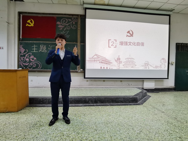 主题汇报会在庄严的国歌声中拉开帷幕。主持人宣布比赛规则及评分细则后,各支部学员正式开始汇报。8名学员声情并茂地展示了自己的学习成果,他们围绕着文化自信、理想信念、党的纪律等主题,对自己在党校培训中所学习的内容进行了讲解和总结,向在场的学员们分享了自己在培训过程中的心得与体会。他们利用丰富多彩的形式,以自己饱含真挚的语言,向在场的学员们传达了青年党员肩负着的责任和使命:作为新时代的青年党员,我们要始终不忘初心,积极进取、以身作则,严明党的纪律,坚定党的路线方针政策,树立崇高远大的理想信念,牢记伟大光荣的历史使命,传承发扬中华民族优秀传统文化,积极学习社会主义先进文化,保持党的先进性,坚定不移地为实现中华民族伟大复兴的中国梦而努力奋斗。