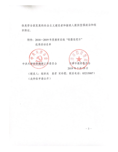 我院化工原理教研室支部党日活动喜获天津市“2018-2019年度教育系统‘创最佳党日’优秀活动”称号
