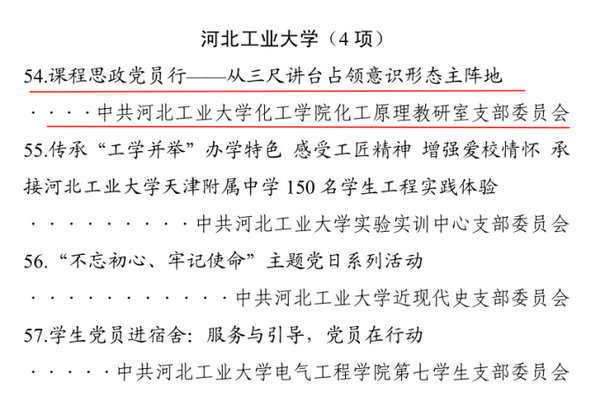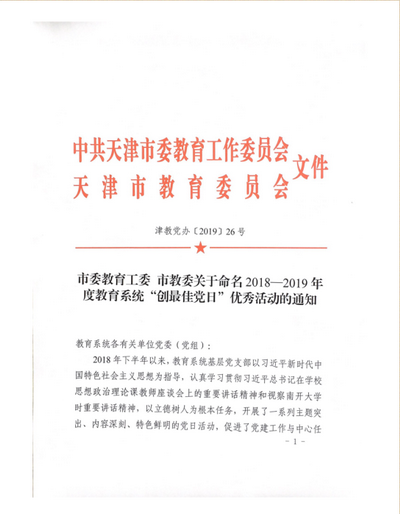 2018年下半年以来,教育系统基层党支部开展了一系列主题突出、内容深刻、特色鲜明的党日活动,按照《教育系统“创最佳党日”活动管理办法》,教育系统62家单位党组织向市委教育工委市教委遴选推荐了一批优秀党日活动,经市委教育工委市教委研究,决定命名南开大学等开展的104项党日活动为20182019年度教育系统“创最佳党日”优秀活动。(排名不分先后)。我校有4项党日活动入选,其中我院化工原理教研室支部委员会党日活动“课程思政党员行——从三尺讲台占领意识形态主阵地”喜获天津市“2018-2019年度教育系统‘创最佳党日’优秀活动”称号。
