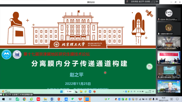 会上,北京理工大学赵之平教授以“分离膜内分子传递通道构建”为题,为参会人员作了精彩大会邀请报告。来自清华大学、天津大学、北京理工大学、北京化工大学、北京工业大学、天津工业大学、北京师范大学、中国矿业大学、北京交通大学、北京建筑大学、北京工商大学、北京林业大学、南开大学、天津科技大学、天津理工大学、河北工业大学、燕山大学、河北科技大学、河北工程大学、中国科学院过程工程研究所、中国科学院生态环境研究中心、中国科学院化学研究所、重庆理工大学等单位的190余名研究生作专题报告,内容涵盖压力驱动及过程,电驱动膜、能源转化与储能膜,渗透汽化膜、疏水膜及过程,气体分离膜及过程,新型膜材料、膜过程,膜耦合、集成及应用等6个主题。来自国内外膜技术领域的专家和研究生积极参与本次论坛的交流,“蔻享学术”平台不完全统计有近两万人次参与论坛直播。